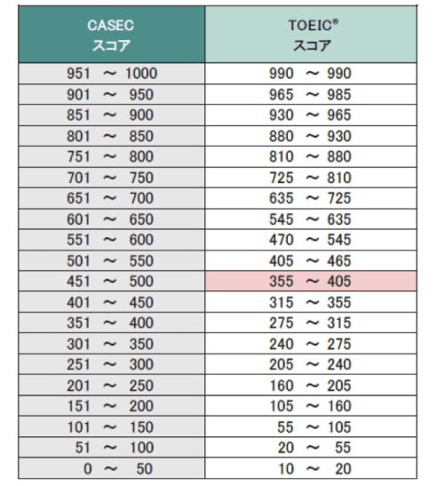 CASECのスコアはTOEICのスコアと相関関係があるため、目安換算が公開されている場合があります。